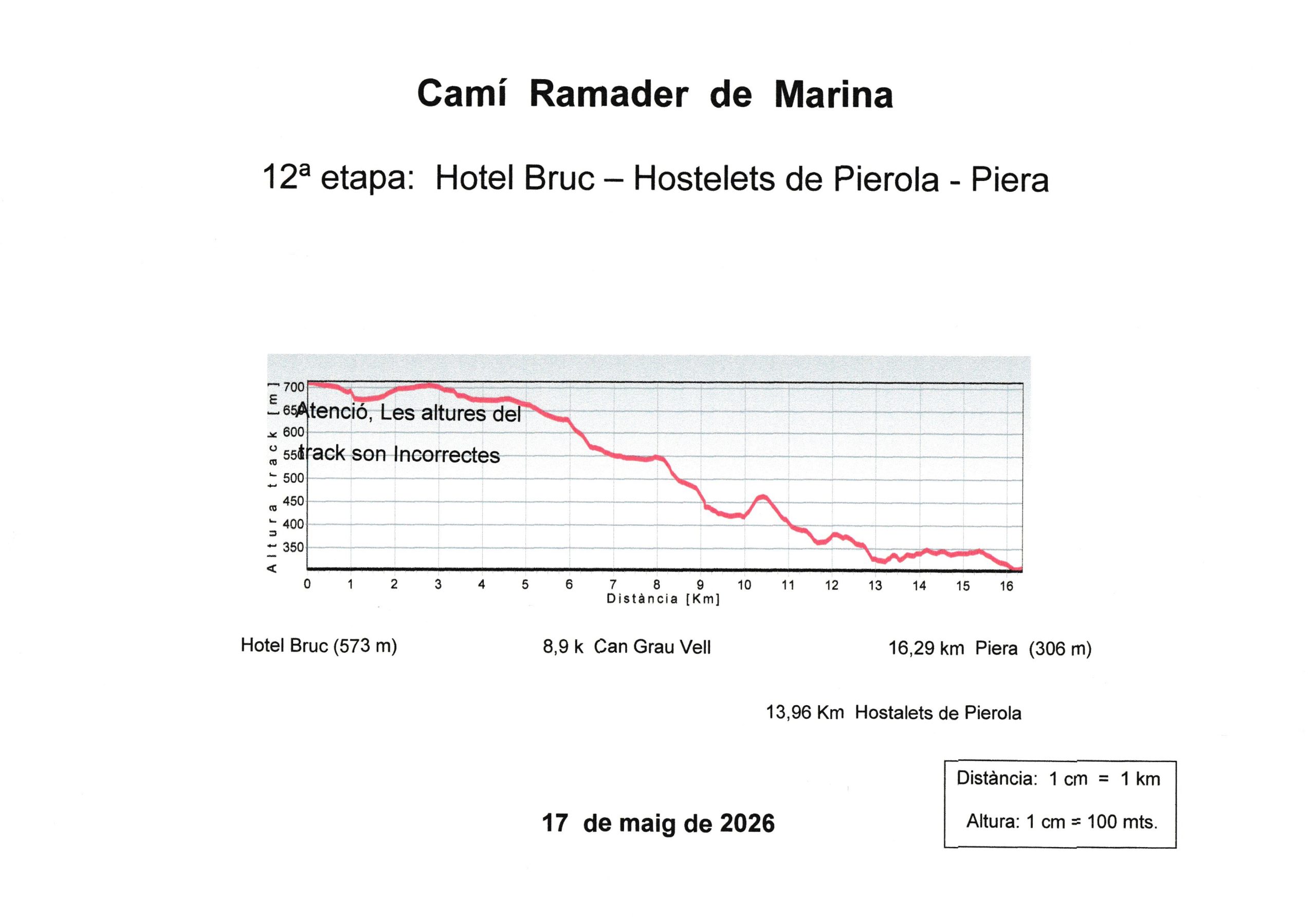 La Secció de Senderisme d’Amics d’El Prat organitza per al diumenge 17 de maig de 2026 la 12a etapa del Camí Ramader de Marina, anirem a peu des del Hotel Bruc passant per Hostalets de Pierola fins a Piera. En total seran 16,29 km.