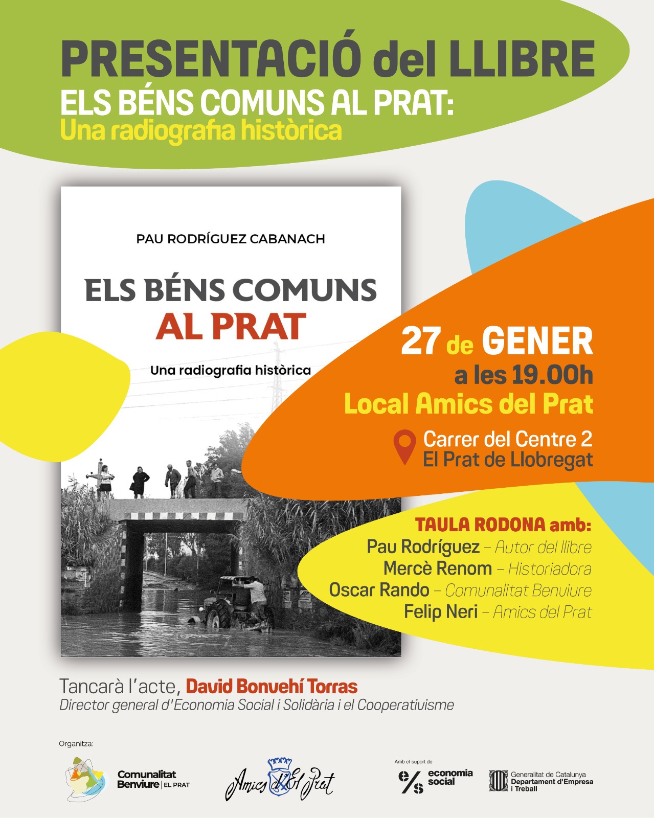 El pròxim dimarts 27 de gener, a les 19.00 h, el local d’Amics d’El Prat (carrer del Centre, 2) acollirà la presentació del llibre Els béns comuns al Prat: una radiografia històrica, de l’historiador Pau Rodríguez Cabanach.