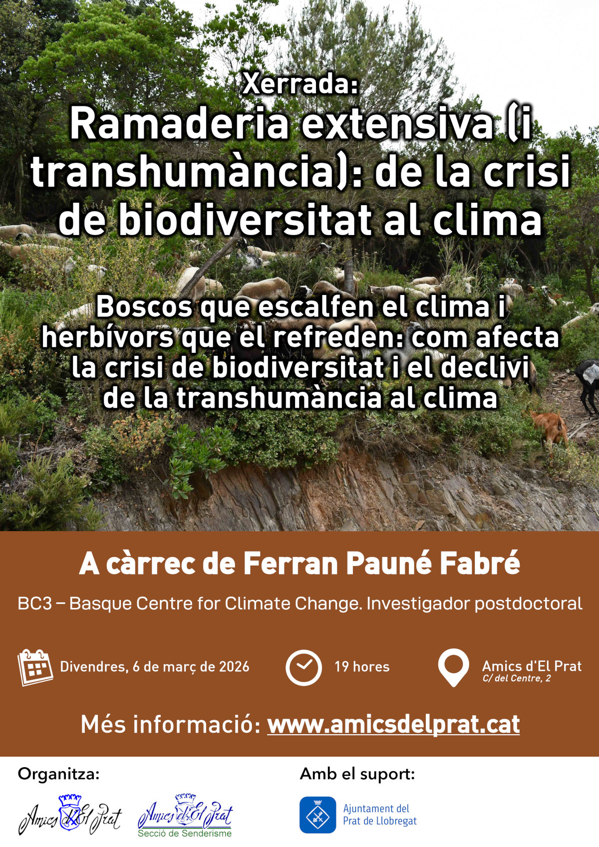 El divendres 6 de març del 2026, a les 19 hores, el local d’Amics d’El Prat acollirà la xerrada titulada “Ramaderia extensiva (i transhumància): de la crisi de biodiversitat al clima”, que anirà a càrrec de Ferran Pauné Fabré, investigador postdoctoral del BC3 – Basque Centre for Climate Change.