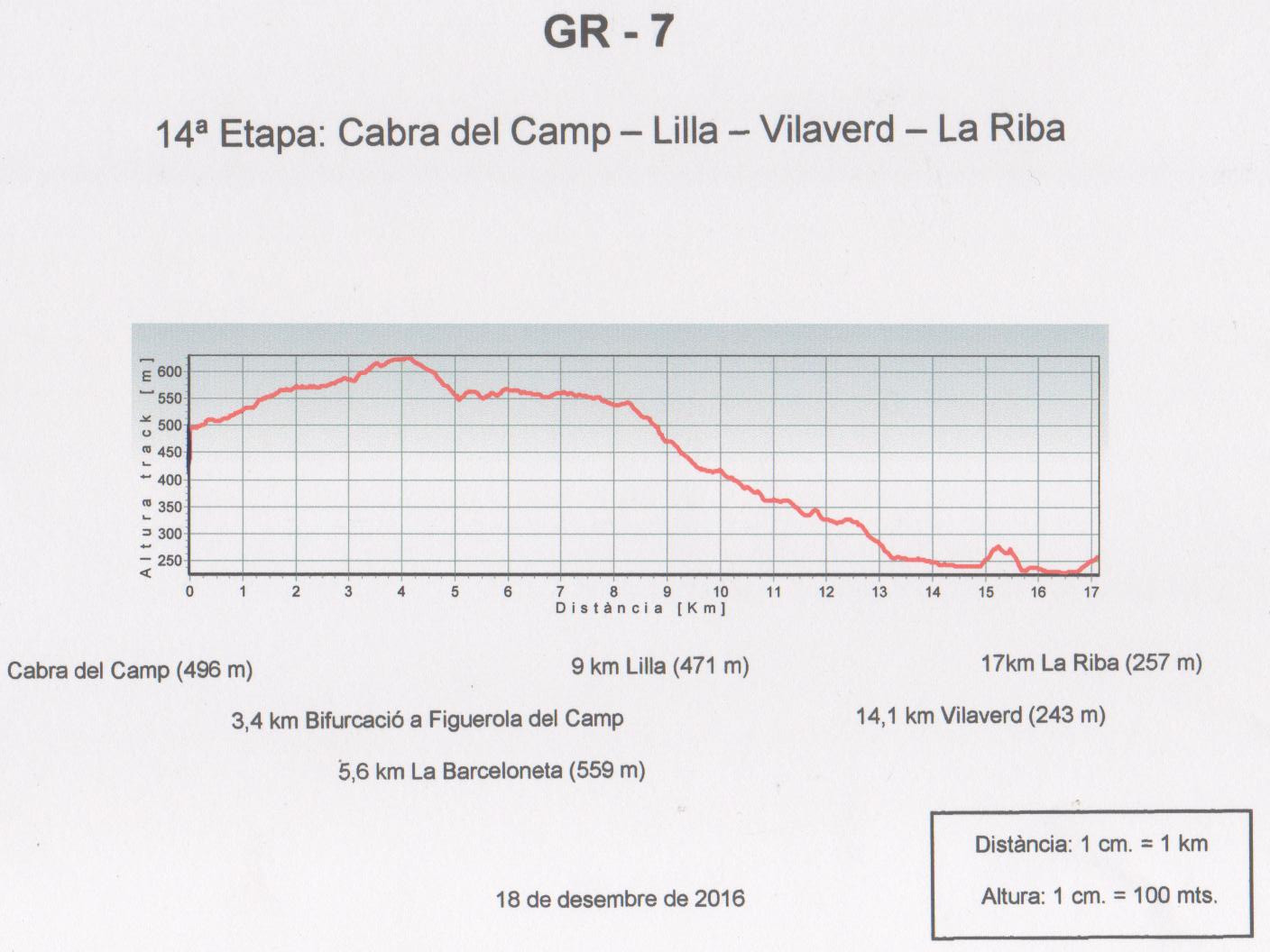 14 etapa de la Cabra del Camp a la RibaLa catorzena etapa del tram català del GR-7 que organitza la Secció de Senderisme d’Amics d’El Prat, tindrà lloc el diumenge 18 de desembre i anirà de Cabra del Camp a la Riba. El recorregut de l’etapa serà de 17 quilòmetres, molt planera amb tendència a anar baixant, i tindrà una durada aproximada de 6 hores.