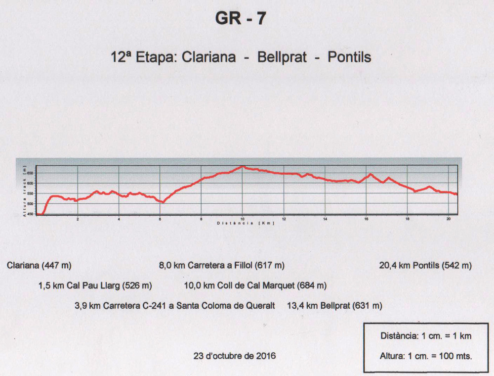 La dotzena etapa del tram català del GR-7 que organitza la Secció de Senderisme d’Amics d’El Prat, tindrà lloc el diumenge 23 d’octubre i anirà de Clariana a Pontils. El recorregut de l’etapa és de 20,4 quilòmetres i només té 200 metres de desnivell, per tant és molt planera. Tindrà una durada aproximada de 6 hores i 30 minuts.